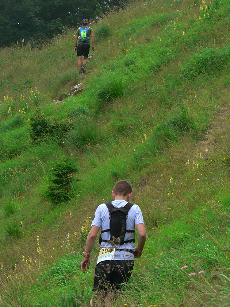 Ten spomenutý rámec možností sa inak poriadne stenčoval, lebo ešte z Hornej lúky dole som sa tešil, že telo si predsa len niečo pamätá, a najmä chodidlá, lebo dali pokoj a neprotestovali, aj keď boli od rána furt v mokrote. Ale práve hore Slovianskou, na zdanlivo neškodnom asfalte, začali štípať, nevďačné hnusy smrduté... Ale už nič, už len trpieť bolo treba. No bolo to niekedy teda poriadne kostrbaté poskakovanie, najmä po kameňoch. Ale inak lúčnato – lesnaté hrebene okolo Jankovej a Skaliek sú celkom príjemné svojím podkladom. Neviem síce, prečo nás orgovia zo Slovianskej doliny vyhnali po zelenej do Sedla pod Hnilickou Kýčerou (v podstate do protismeru) a nie po modrej viac na juh, do Sedla pod Úplazom, ale vraj nabudúce to možno prehodnotia :-))) Inak, mohli by nás možno nabudúce poslať z Hornej lúky aj normálne, po hrebeni až na Hnilickú Kýčeru a z nej do Valče na K7 po lyžiarskom chodníku. Zreteľný aj značený je dobre a bola by to krajšia trasa ako po tej nekonečnej šotoline Trebostovskou dolinou.
